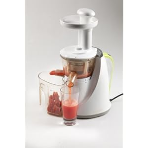 Technik mit niedriger Geschwindigkeit. Das System ist völlig anders als das herkömmliche Juicer System. Den maximalen Vitamingehalt, Nährwert, Geschmack und Saft mit einer minimalen Menge Obst oder Gemüse erzielen, indem gepresst anstatt gequetscht wird. -Gesund: Mit dem Slow Juicer wird mit jedem Obst oder Gemüse ein hervorragender Geschmack und maximaler Vitamingehalt erzielt. -Sparsam: Sie erhalten die maximale Menge Saft aus einem Minimum an Gemüse oder Obst. Die übrig gebliebenen Schalen oder das Fruchtfleisch kann auch für Konfitüre, Kekse oder Rührkuchen usw. verwendet werden. -Einfache Reinigung: Das Gerät kann ganz einfach gereinigt werden. Wenn Sie ein anderes Gemüse oder Obst verarbeiten möchten, gießen Sie zuerst ein Glas Wasser durch das Gerät. Sie können jetzt problemlos mit einer anderen Gemüse- oder Obstsorte weiter pressen. Geräuscharm: Das Geräusch ist auf ein Minimum beschränkt, da das Gerät langsam auspresst, anstatt mit hoher Geschwindigkeit zu quetschen. -Langlebigkeit: 2 Jahre Garantie + 10 Jahre Garantie für den Motor. -Säfte: Sie können aus all Ihren Lieblingsobst oder Gemüse Säfte machen.